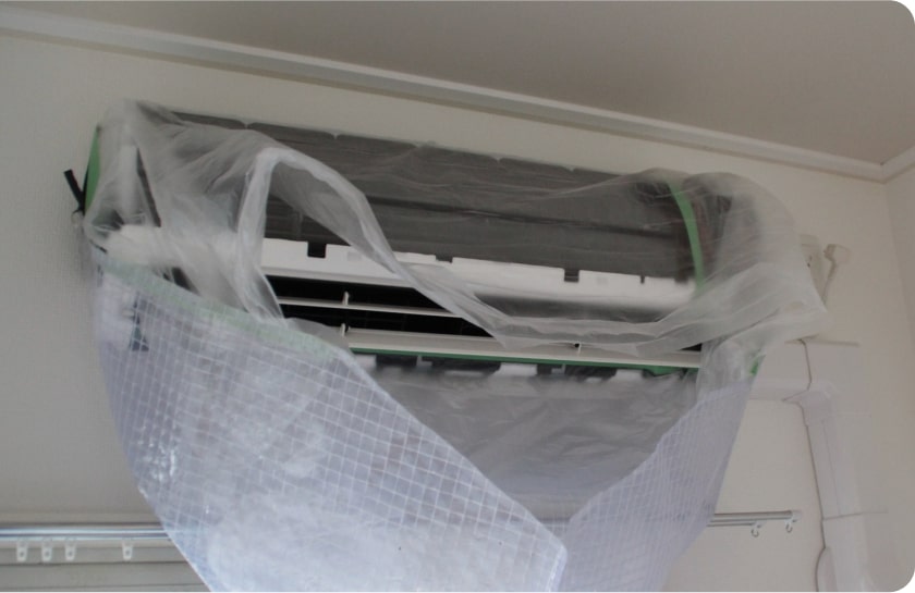 エアコン下にスペースを作ります。その時お客様の荷物が汚れたりしないように養生シートを掛けます。試運転を行い、エアコンの動作確認をさせて頂きます。