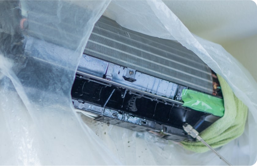 熱交換器に抗菌コートをかけて、洗浄した各パーツを元通りに組み立てて、汚水は外へ流します。養生シートも撤去して最後にエアコンを拭き上げて完了となります。